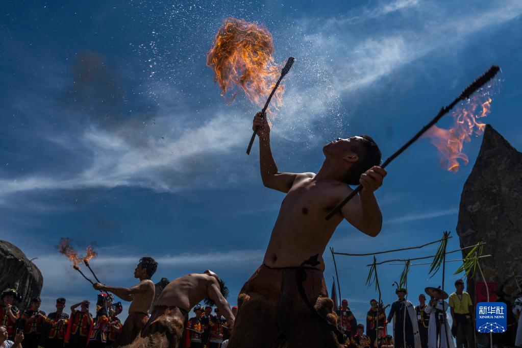 7月22日,彝族群众在贵州省毕节市百里杜鹃管理区参加火把节取火仪式。