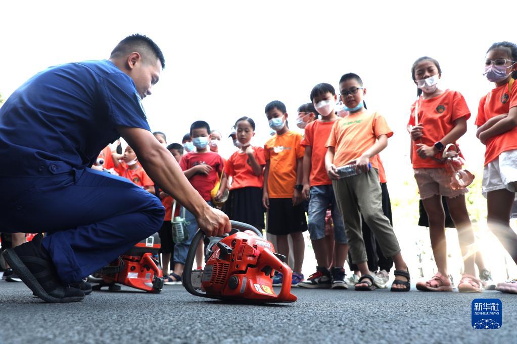 7月30日,在福建省龙岩市消防救援支队曹溪路特勤站,消防员为小学生们讲解消防器材知识。