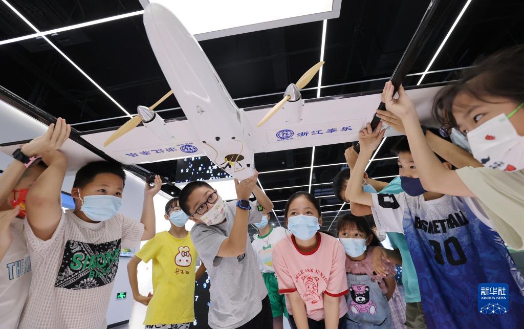7月30日,浙江省湖州市德清县三桥小学学生在德清地理信息科技馆了解无人机知识。