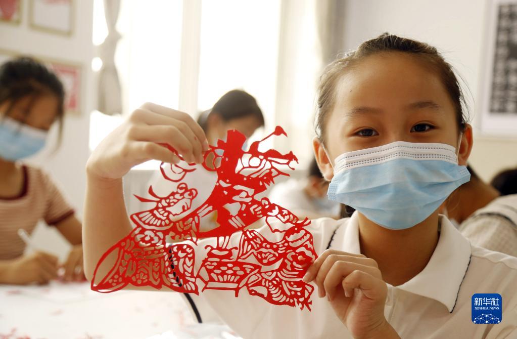 7月30日,河北省邢台市第二十八中学学生展示在老师指导下制作的刻纸作品。