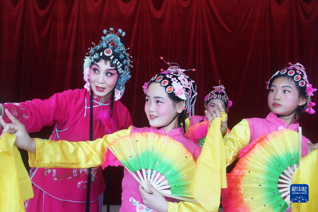 7月29日,在河北省唐山市丰润区刘家营乡新时代文明实践所,评剧演员在指导孩子学习评剧表演技艺。