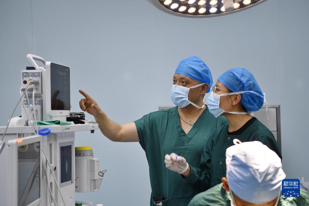 7月31日,在阿里地区人民医院手术室,西藏自治区人民医院麻醉科医生达娃吾珠(左一)指导当地麻醉医生旦增次白进行麻醉监测。