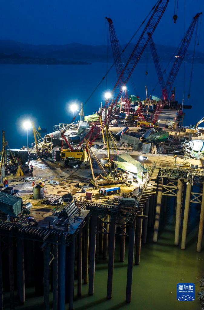 在三峡大坝上游湖北省宜昌市秭归县长江航道宜昌应急抢险打捞基地建设工地上,工人们抢抓汛期三峡水库水位降低时机,挑灯夜战赶工期,力争早日完工。长江航道宜昌应急抢险打捞基地共新建抢险打捞工作船码头一个,泊位一个。