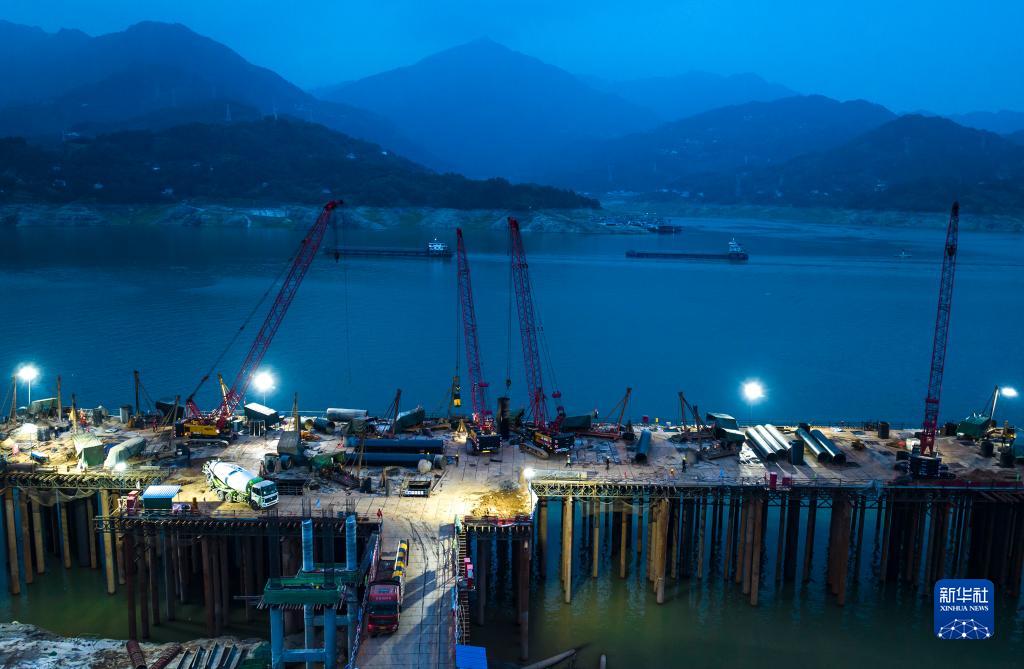 在三峡大坝上游湖北省宜昌市秭归县长江航道宜昌应急抢险打捞基地建设工地上,工人们抢抓汛期三峡水库水位降低时机,挑灯夜战赶工期,力争早日完工。长江航道宜昌应急抢险打捞基地共新建抢险打捞工作船码头一个,泊位一个。