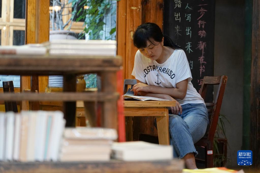 一名游客在留坝县城老街上的一家书屋内读书(2020年9月3日摄)。