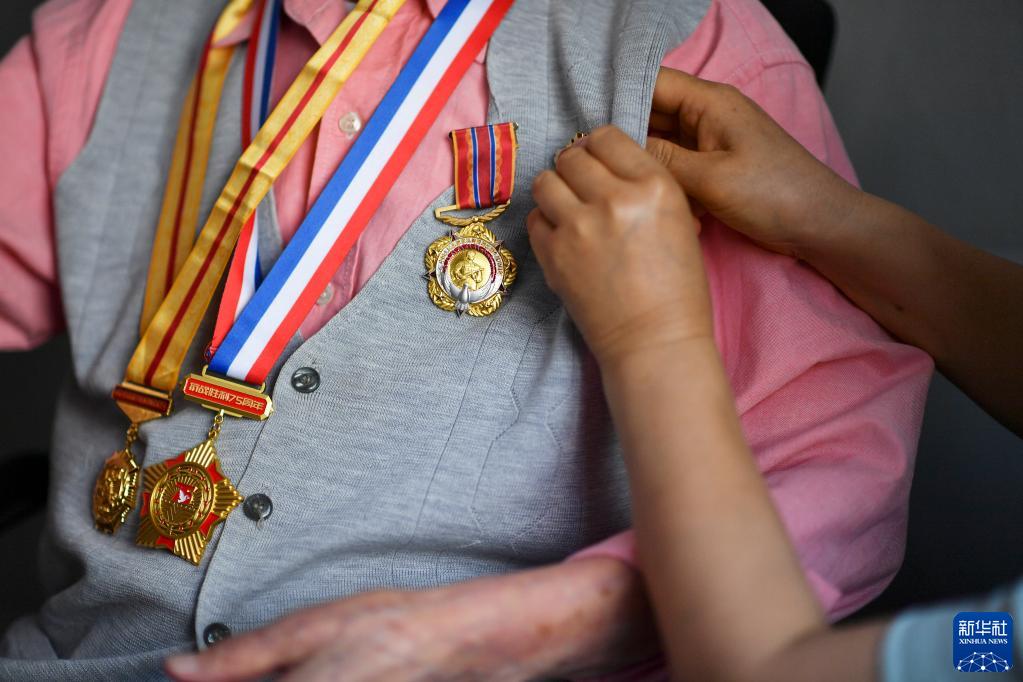 6月13日,在陕西省西安市,抗战老战士孙传聚的女儿为父亲佩戴纪念章。