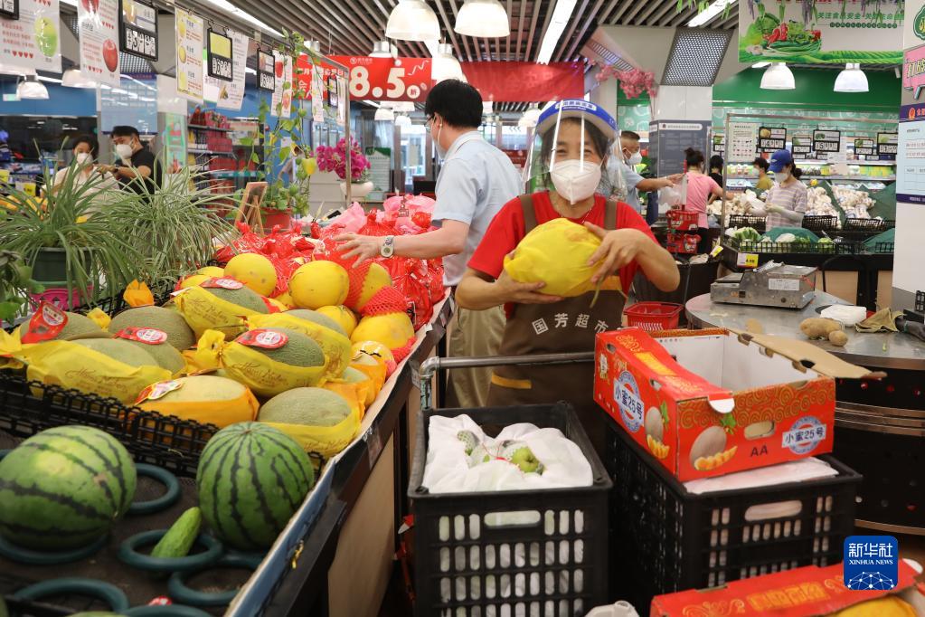 8月1日,在兰州市城关区国芳综合超市广场店,工作人员在补货。