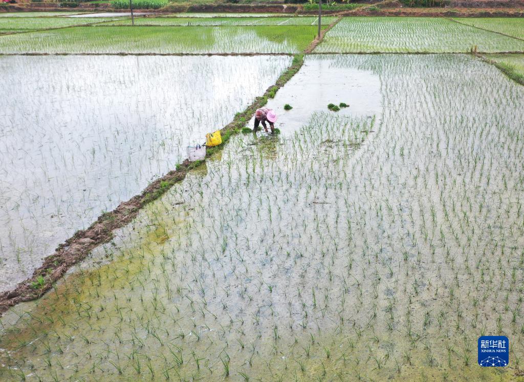 8月2日,村民在广西南宁市邕宁区水田里抢插晚稻。