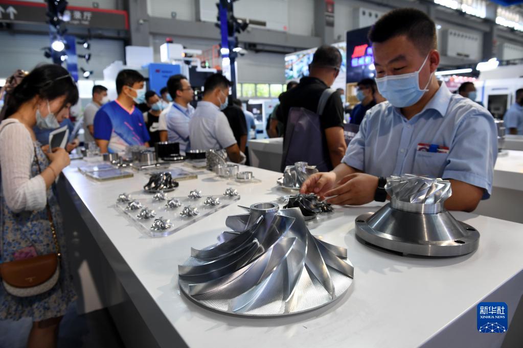 8月3日,参观者在第25届青岛国际机床展览会互动区体验精密机床加工出的构件。