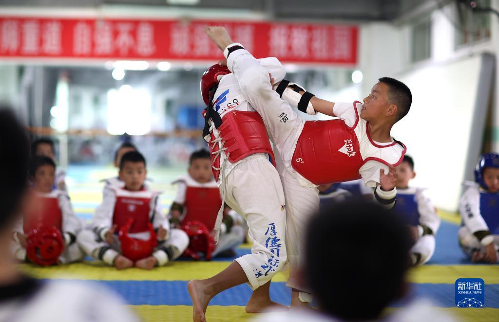 8月3日,孩子们在贵州省黔东南苗族侗族自治州丹寨县一家跆拳道馆练习跆拳道。