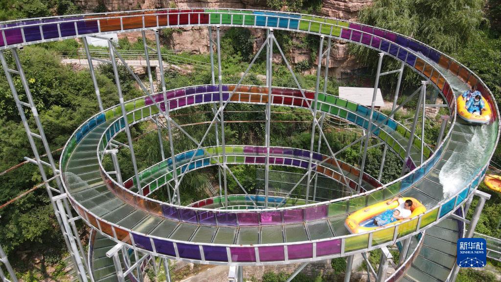夏日炎炎,河北省邢台市各景区依托太行山丰富的山水资源,推出的漂流等水上休闲娱乐项目受到游客青睐。人们在太行山间漂流、戏水,享受清凉。