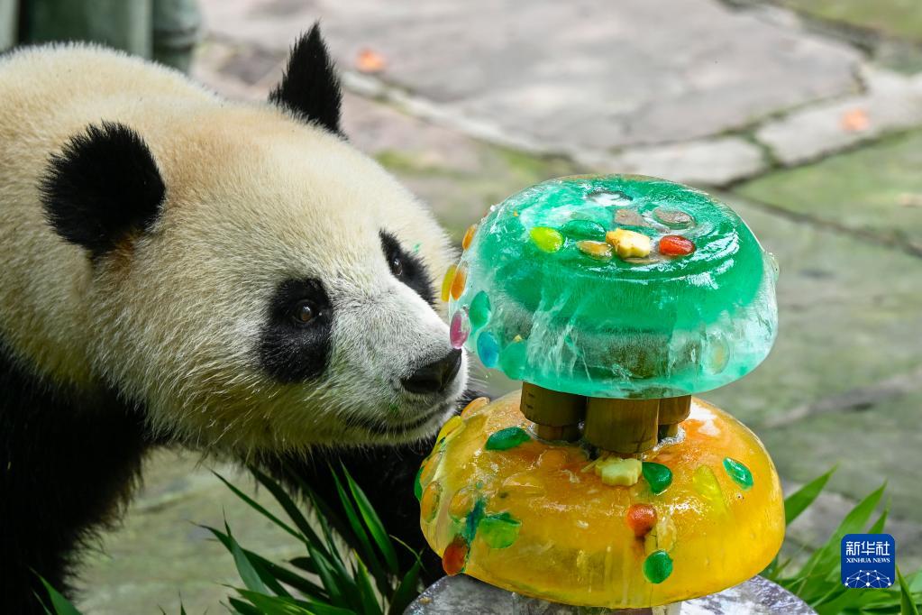 8月3日,在中国大熊猫保护研究中心雅安基地,大熊猫“安安”准备享用美食。