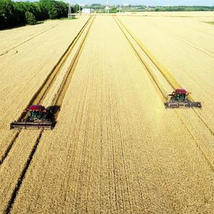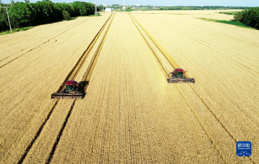 8月2日,在位于黑龙江黑河市的北大荒集团红星农场有限公司有机麦田,农机手操作机械收割小麦。