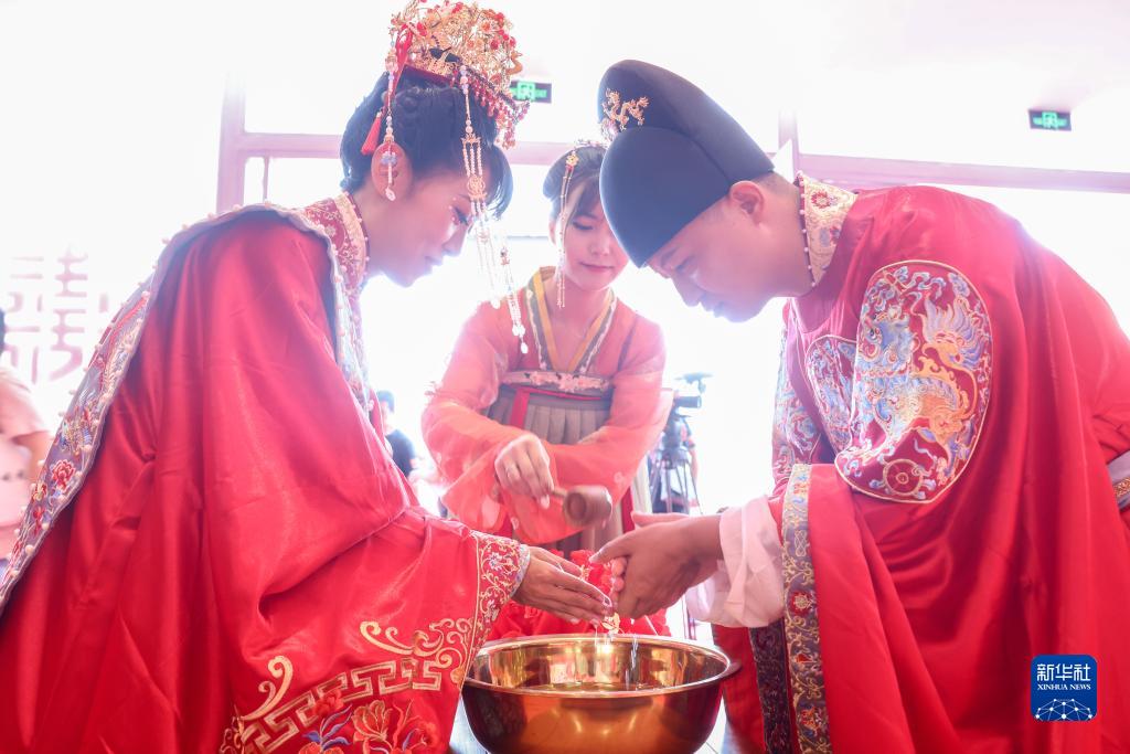 当日是七夕,2022(壬寅)年贵阳孔学堂中华婚礼在贵阳孔学堂举办,12对新人身穿中式婚服通过合卺礼、解缨结发、共书婚帖等方式完成传统婚礼仪式。