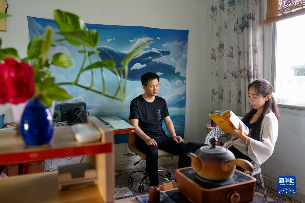 在四川省什邡市马井镇同心村,宇晓为王忠礼读书(8月2日摄)。