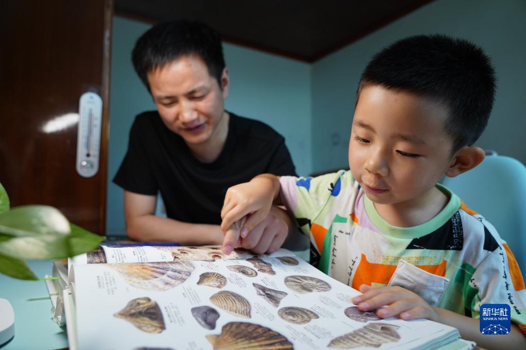 在四川省什邡市马井镇同心村,王忠礼和儿子在读书(8月2日摄)。
