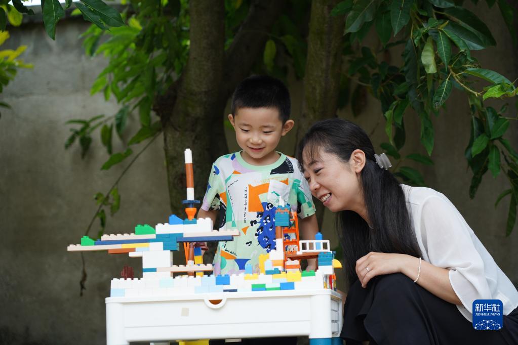 在四川省什邡市马井镇同心村,宇晓和儿子在院中玩耍(8月2日摄)。