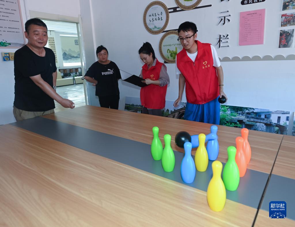 8月4日,在东林镇新时代文明实践所内,残疾人在参加特色文体活动项目“桌上保龄球”。