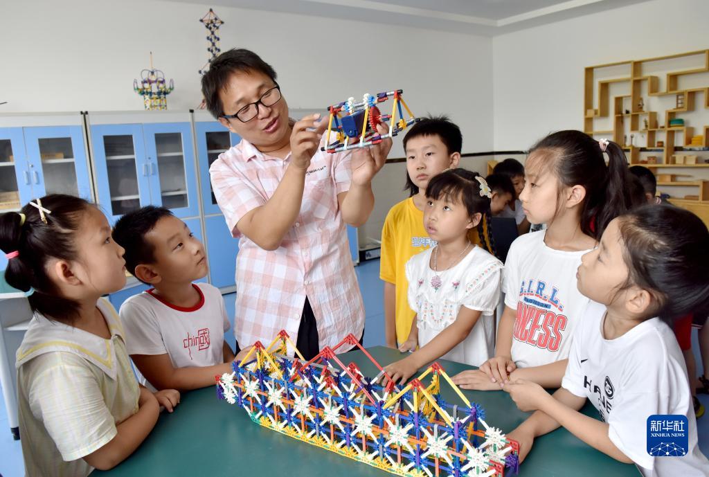 8月5日,河北省邢台市南和区青少年活动中心老师指导学员进行手工创意搭建。