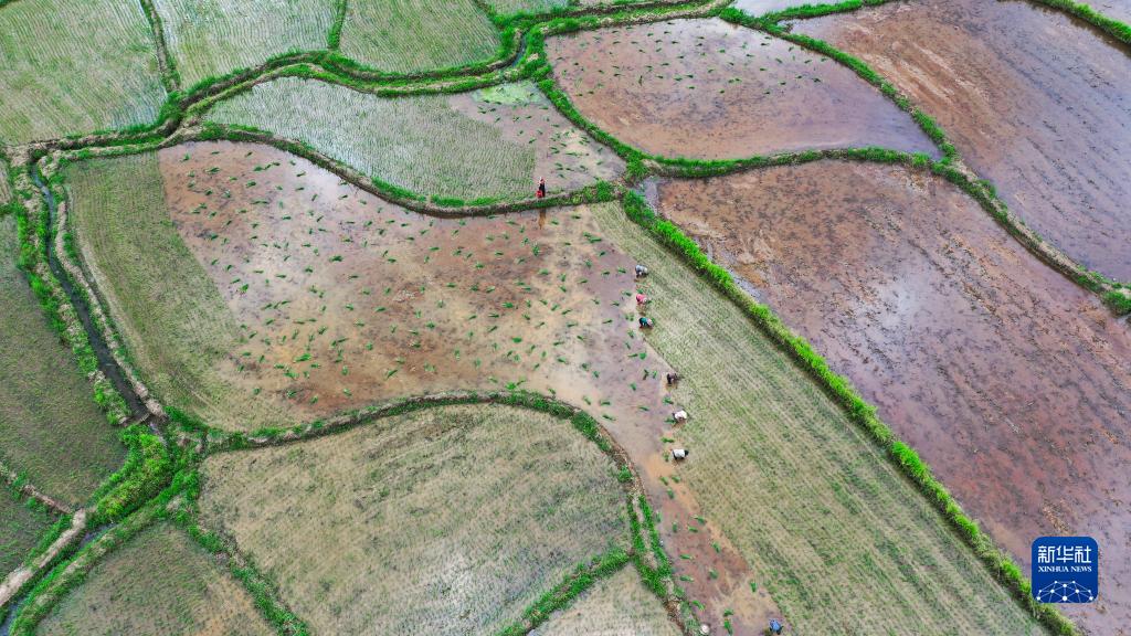 8月5日,在湖南省常宁市胜桥镇泉峰冠村,农民在抢插晚稻(无人机照片)。