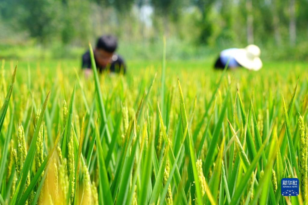 8月5日,河北省唐山市丰南区岔河镇杨义口头村的农民在水稻田间劳作。