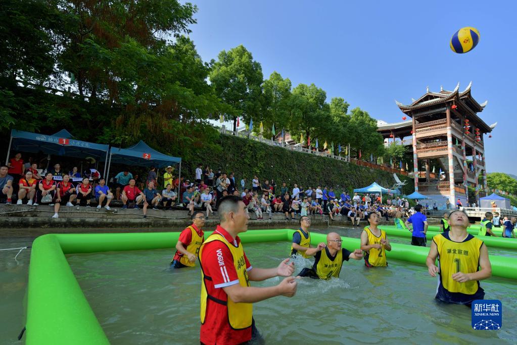 近日,湖北省宣恩县在当地仙山贡水旅游区的贡水河上举行水上运动会。别具一格的“水上排球”项目吸引了众多市民和游客参加比赛,享受水上趣味运动带来的欢乐。