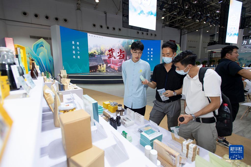 8月5日,在2022年世界大健康博览会上,观众在湖北十堰展厅参观。