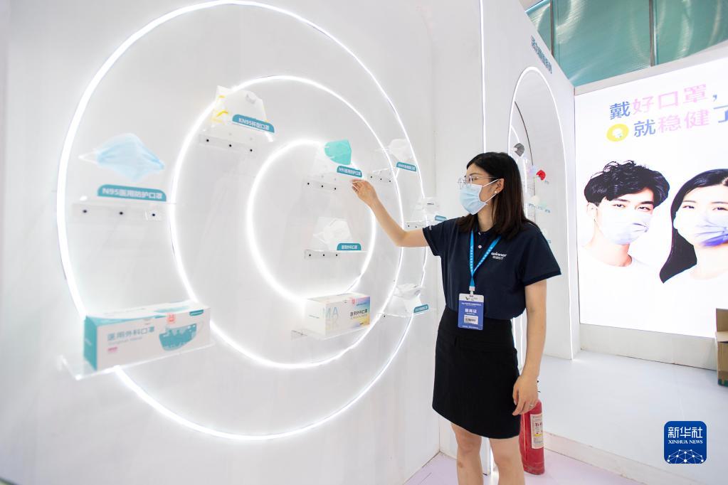 8月5日,在2022年世界大健康博览会稳健医疗展厅,工作人员向观众展示口罩产品。