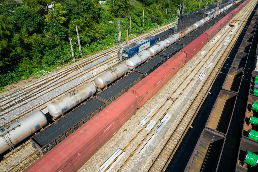 8月5日,满载电煤的列车驶入湖南株洲北站(无人机照片)。