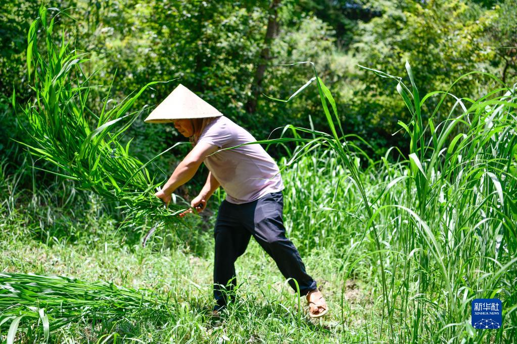 8月3日,贵州省台江县台盘乡棉花村村民在割草,准备给蚂蚱投食。