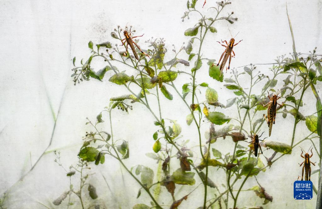 在贵州省台江县台盘乡棉花村拍摄的大棚养殖的蚂蚱(8月3日摄)。