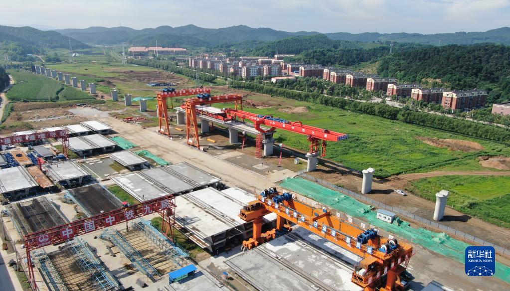 8月6日拍摄的沈白高铁首孔箱梁架设现场(无人机照片)。