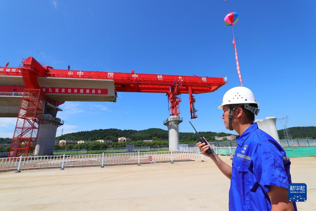 8月6日,中铁九局工程技术人员在现场沟通箱梁架设情况。