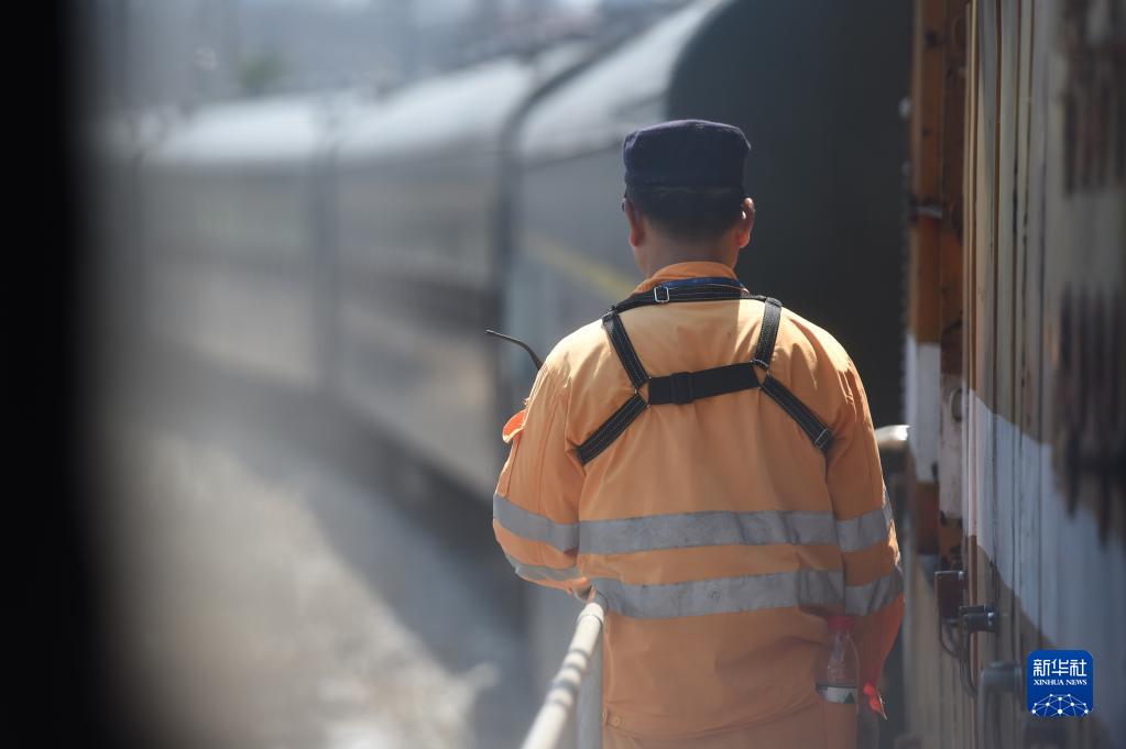 8月5日,合肥火车站运转车间调车长李健在调车机车上瞭望,保障调车安全。