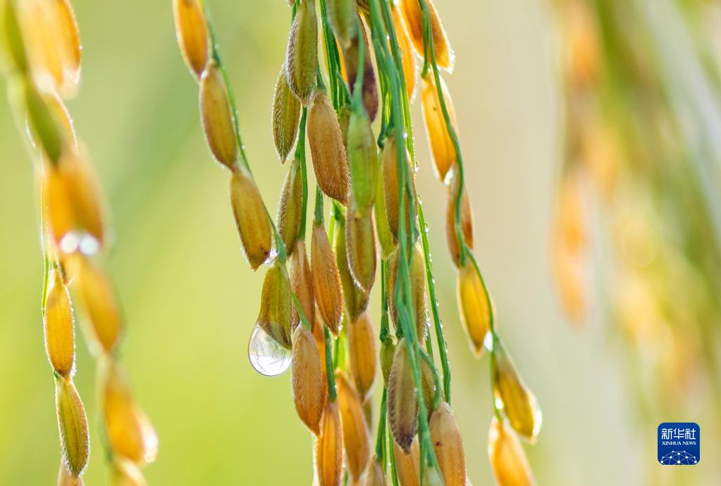 7月24日,在广西南宁市邕宁区蒲庙镇,稻穗上挂着露珠。