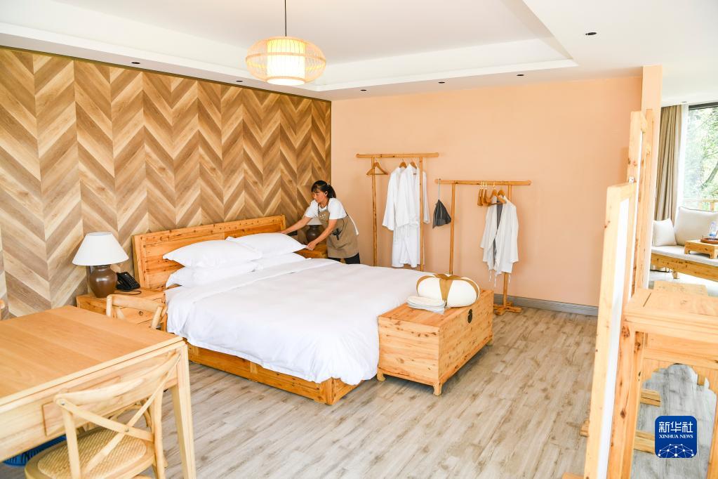 8月2日,重庆万州三峡恒合旅游度假区一家民宿的工作人员在整理房间。