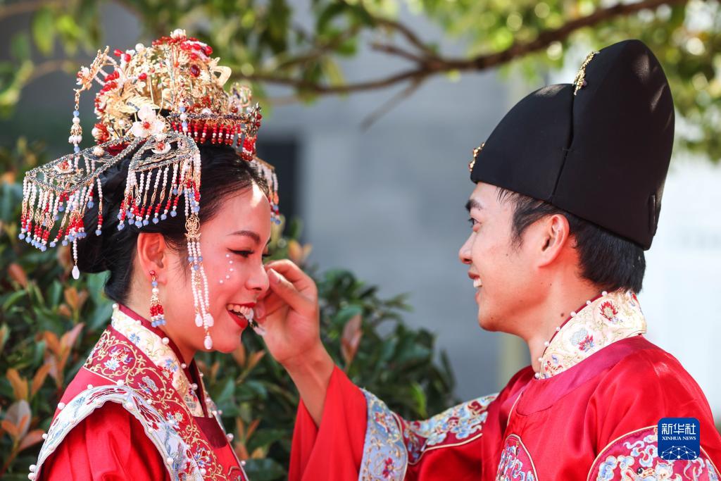8月4日,新郎在婚礼现场为新娘整理发饰。8月4日是七夕,2022(壬寅)年贵阳孔学堂中华婚礼在贵阳孔学堂举办,12对新人身穿中式婚服通过合卺礼、解缨结发、共书婚帖等方式完成传统婚礼仪式。