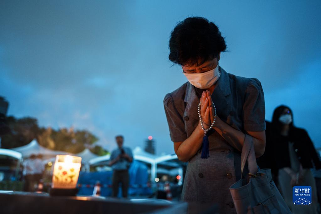 8月6日,一名女子在日本广岛和平纪念公园的和平都市纪念碑前祈祷。