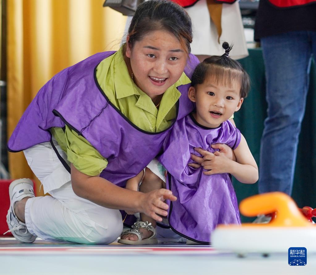 小朋友和家人一起参加“陆地冰壶”比赛(8月6日摄)。