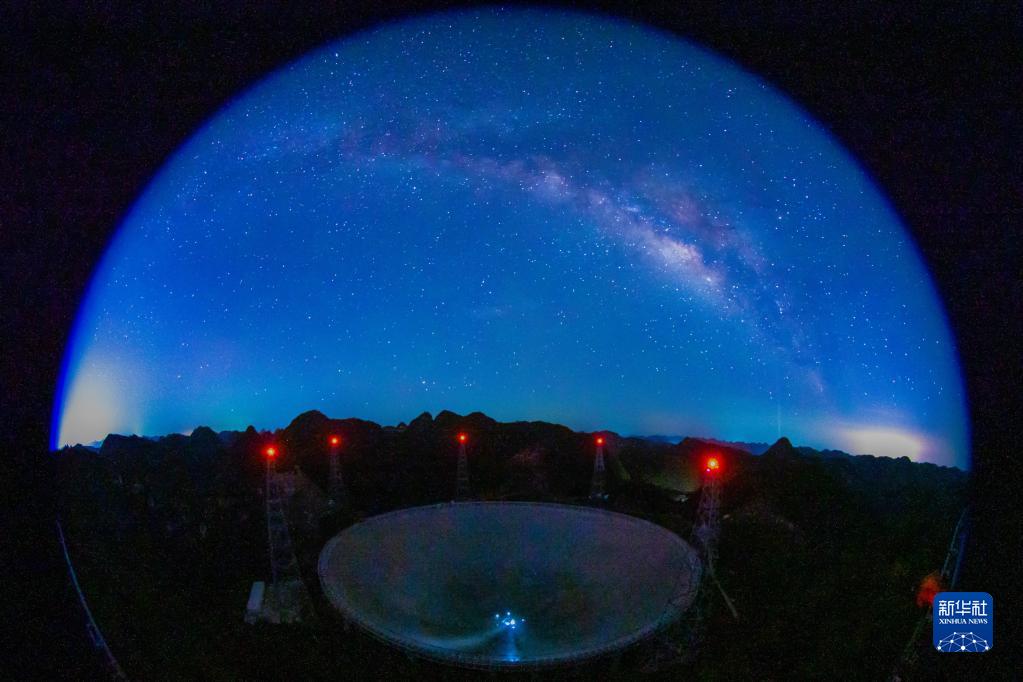 银河下的“中国天眼”全景(2022年7月24日维护保养期间鱼眼镜头拍摄)。