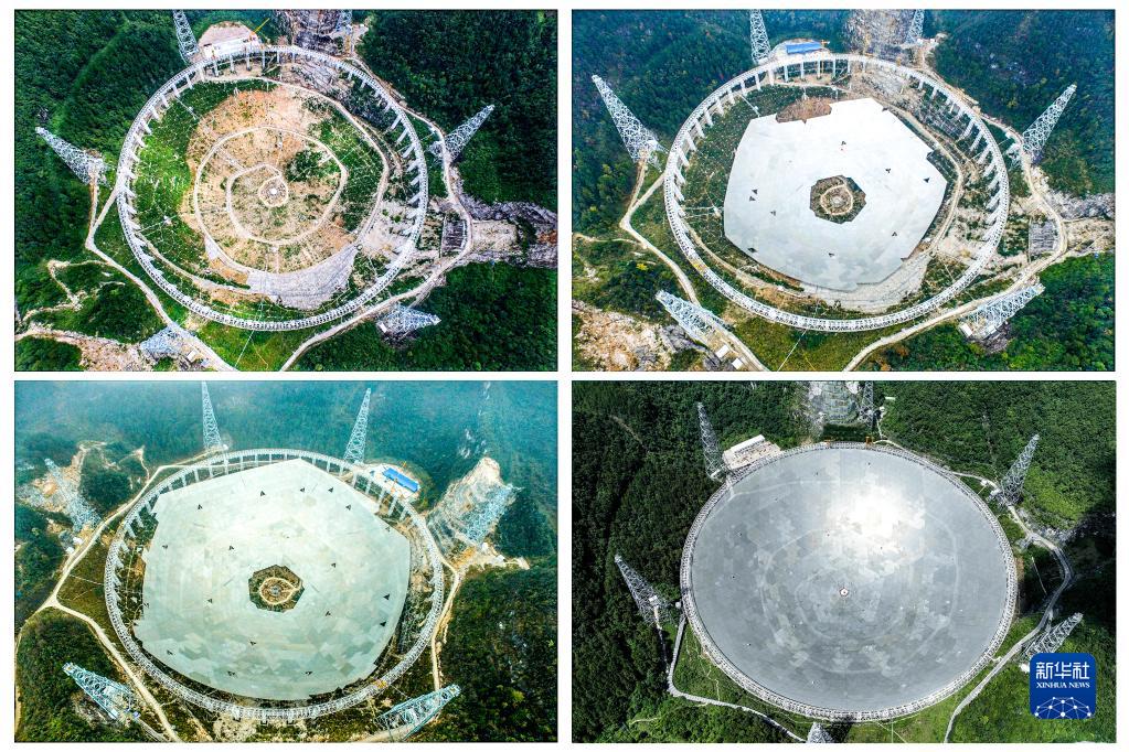 拼版照片:左上为“中国天眼”拼装第一块反射面板(无人机照片,2015年8月2日摄);右上为“中国天眼”反射面板安装近半(无人机照片,2015年12月16日摄);左下为“中国天眼”反射面板安装近八成(无人机照片,2016年3月9日摄);右下为2022年7月21日拍摄的“中国天眼”全景(无人机照片,维护保养期间拍摄)。