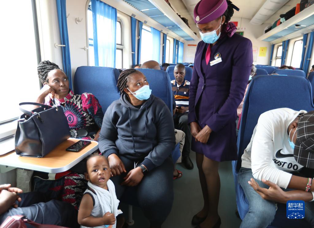 7月29日,列车员菲奥娜(站立者)在蒙内铁路客运列车上与乘客交流。