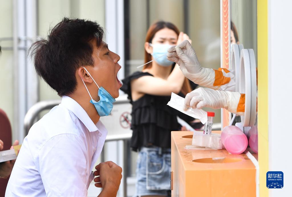 8月7日,居民在海口市龙华区万象城采样点进行核酸检测。