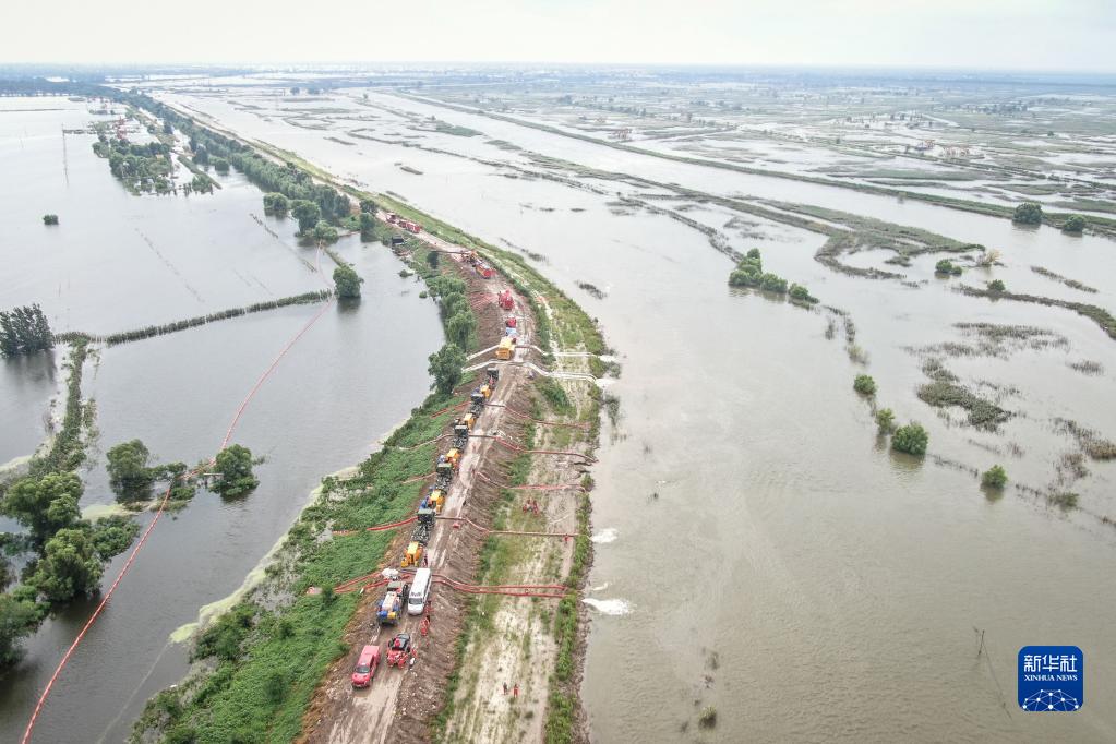 8月7日,抢险人员在辽宁盘锦绕阳河左岸曾经的河堤溃口北段进行排涝作业(无人机照片)。