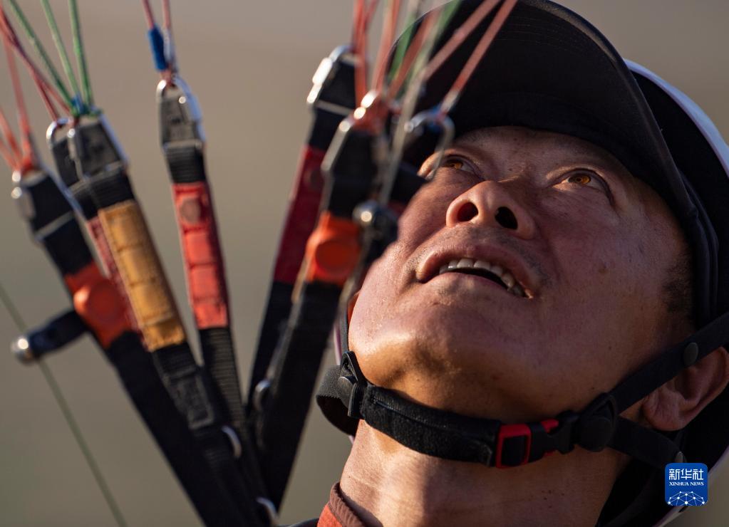在新疆乌鲁木齐市南郊山间,陈瑞峰在飞行训练时,将伞牢牢控制在头顶(6月11日摄)。新华社记者 胡虎虎 摄