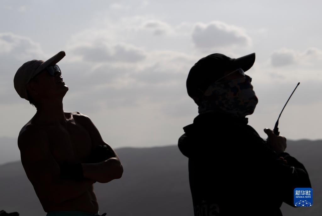 在新疆乌鲁木齐市南郊山间,陈瑞峰(左)和同伴在地面观察其他伞友的飞行训练(5月29日摄)。新华社记者 胡虎虎 摄
