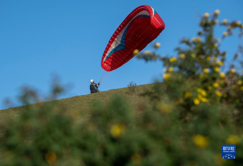在新疆乌鲁木齐市南郊山间,陈瑞峰控制着被风吹开的滑翔伞,即将腾空起飞(5月29日摄)。新华社记者 胡虎虎 摄