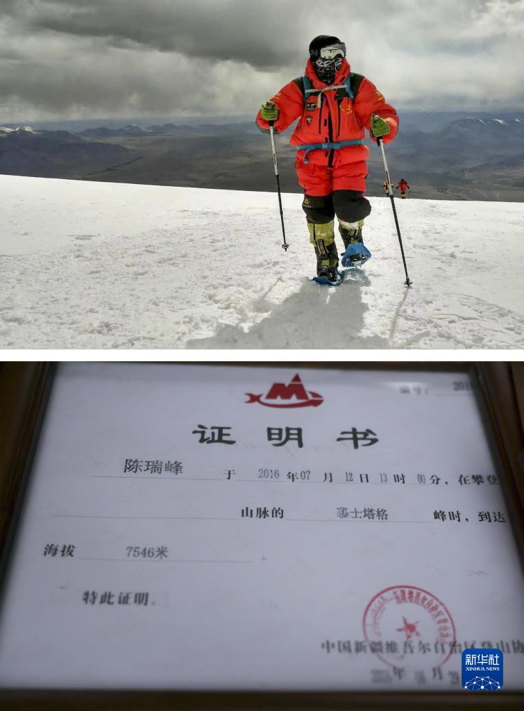 拼版照片:上图为陈瑞峰在2016年7月攀登海拔7500多米的慕士塔格峰时的留影(受访者供图);下图为2022年6月14日翻拍的陈瑞峰登顶慕士塔格峰证书(新华社记者 胡虎虎 摄)。新华社发