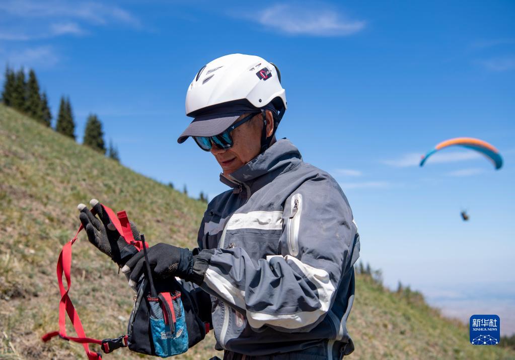 在新疆吉木萨尔县新地乡花儿沟景区,陈瑞峰在起飞前整理对讲机等装备(5月21日摄)。新华社记者 胡虎虎 摄