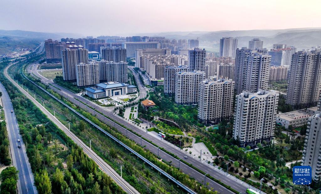 宽阔的绿荫大道穿越神木市滨河新区(8月4日摄,无人机照片)。神木市着力开展生态空间绿化美化,提供优质生态产品,逐步形成功能完备的生态资源空间布局。